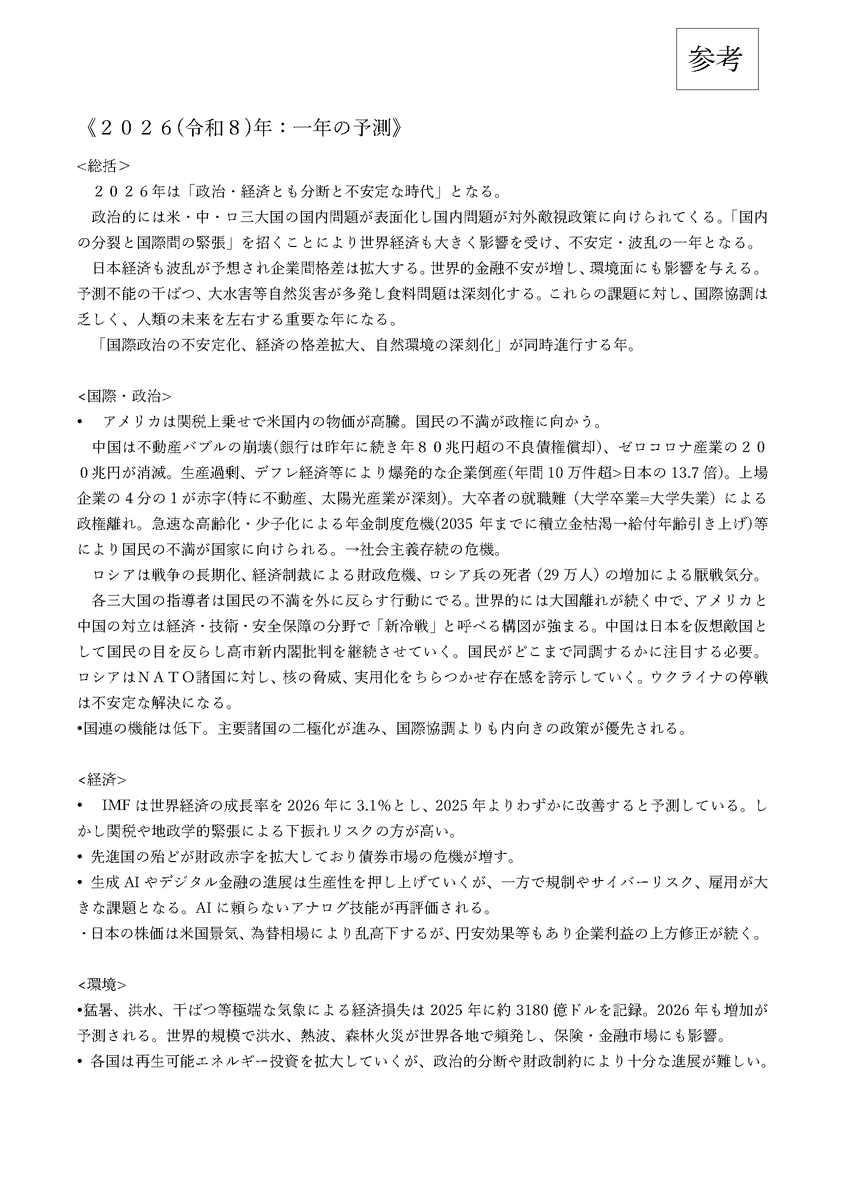 新年明けましておめでとうございます。マイスター会会員の皆様、良い新年をお迎えでしょうか。昨年は、全技連マイスター会の活動に格別のご理解とご協力を賜り、心より御礼申し上げます。昨年は米国、中国、ロシアという三大国の指導者に世界諸国が大きく影響を受けた年でもありました。今年もこの三国の動向に大きく左右される一年になりそうです。私は今年も、「一年の予測」を作成しました。関心のある方はご覧いただければ幸いです。
