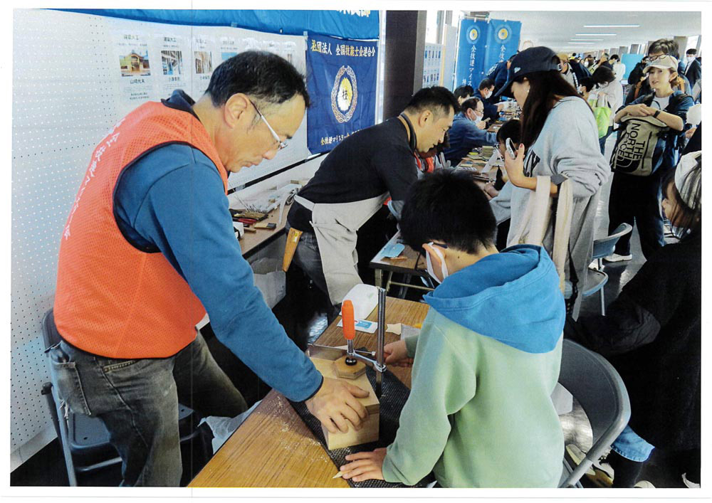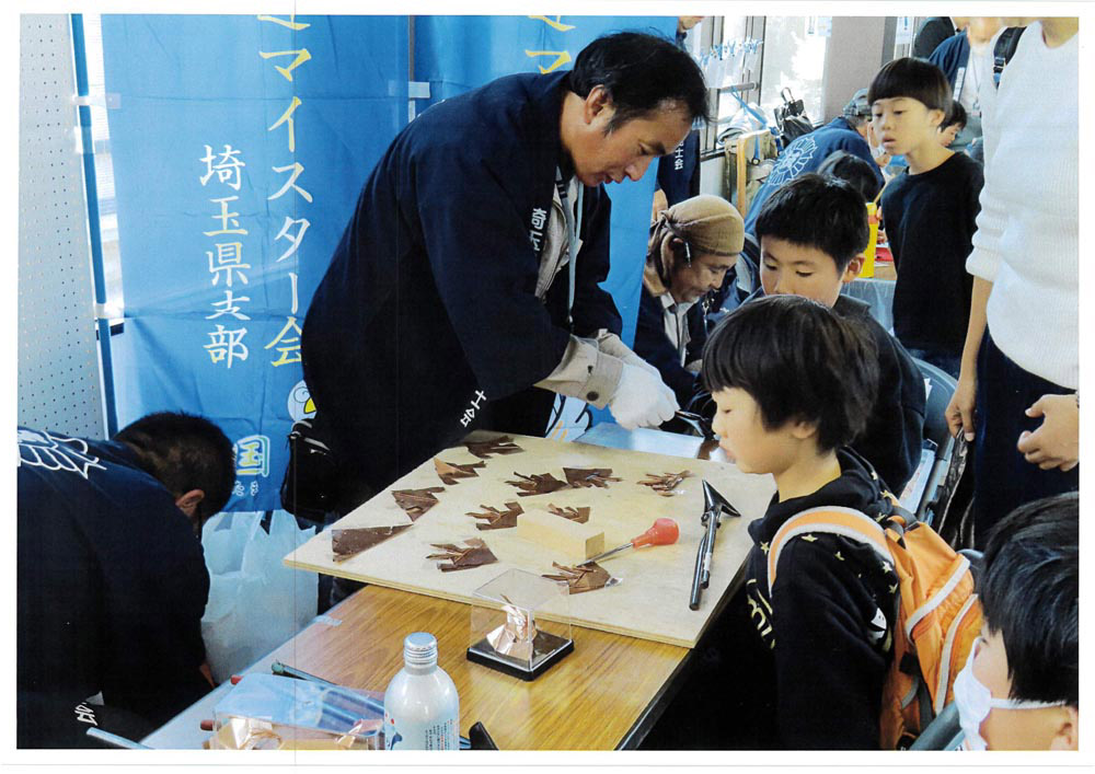 | 〇内 容 | 1 全技連マイスター会埼玉県支部の会員を紹介するパネルの展示を行って、会員の優れた技能と実績についてアピールを行いました。 2 来場者にものづくりの楽しさと素晴らしさを伝える「ものづくり体験教室」を行いました。 (1) 畳コースターの製作体験 体験者数:60名 (2) 木製コースターの製作体験 体験者数:50名 (3) 革カードケースの製作体験 体験者数:59名 (4) 銅板折り紙兜の製作体験 体験者数:50名 |